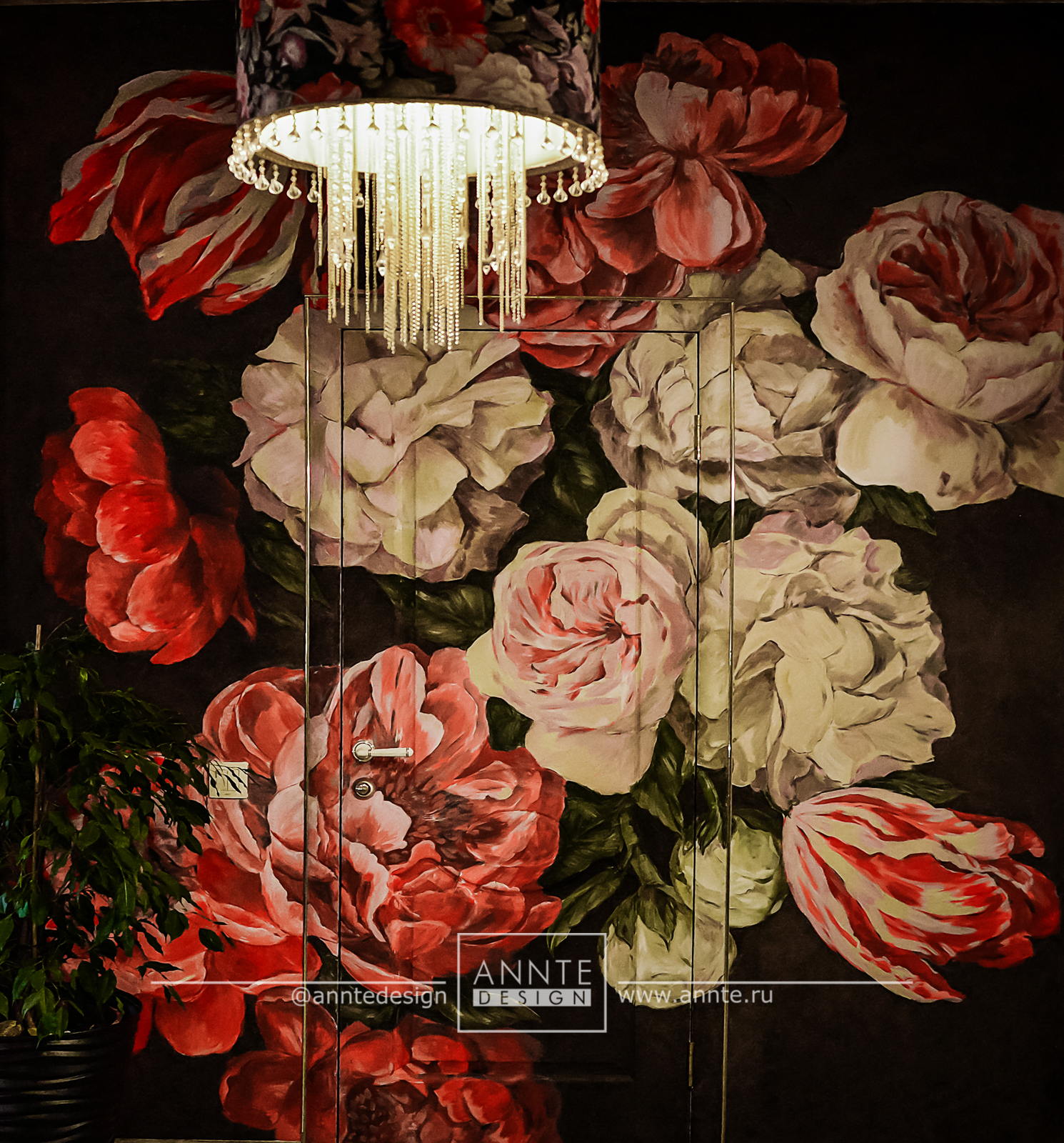 Основной цвет стен светло-серый, - это своего рода чистый холст, на котором пишется картина. А в некоторых комнатах мы сделали акцентные стены. Например, как только заходим в дом, сразу видим стену, расписанную цветами в голландском стиле. Дверь в санузел, расположенная на этой стене, тоже расписана, таким образом она становится не заметной, такое решение удивляет и восхищает гостей, впервые оказавшихся у нас. Люстра в холле выполнена в ткани в таком же мотиве, как и стена, на фоне которой она висит. Вообще то вернее будет сказать, что это стена расписана по мотивам люстры, так как сначала мы изготовили у себя в мастерской эту люстру, а потом уже под нее расписали стену.