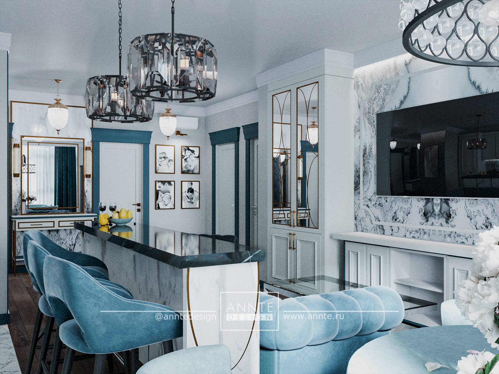 По стилю отдали предпочтение Ар-деко и Неоклассике, выбрали отделочные материалы светлых тонов, включили в интерьер элементы из мрамора.